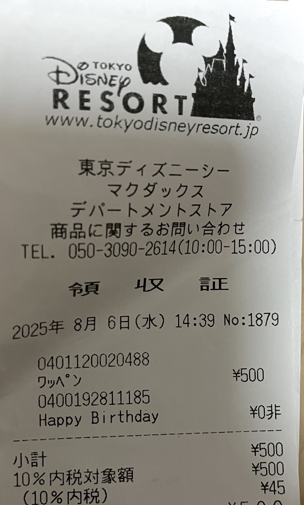ディズニーのレシートを